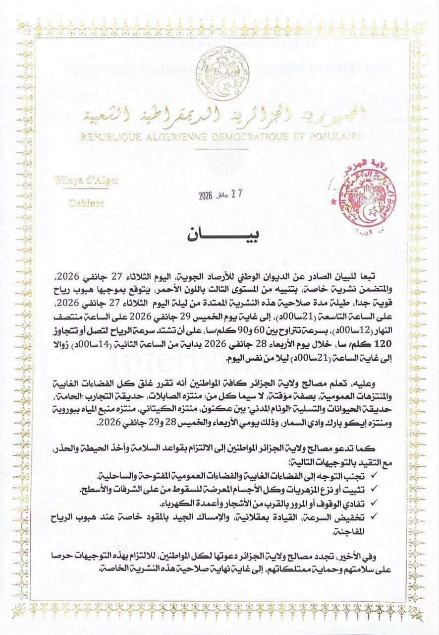 أعلنت مصالح ولاية الجزائر، في بيان لها، اليوم الثلاثاء. عن غلق كل الفضاءات العمومية والمنتزهات الغابية بشكل مؤقت، على إثر صدور نشرة جوية خاصة من الديوان الوطني للأرصاد الجوية. تُصنَّف في المستوى الثالث (باللون الأحمر)، تتوقع هبوب رياح قوية جدًا على الولاية.